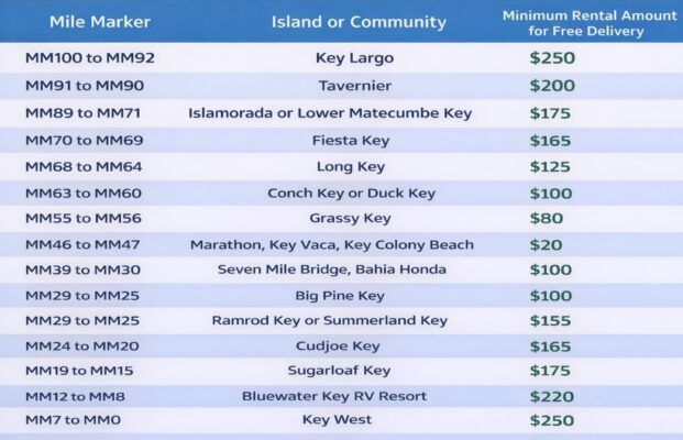 This table below shows the minimum rental or delivery fees by mile marker throughout the Florida Keys.