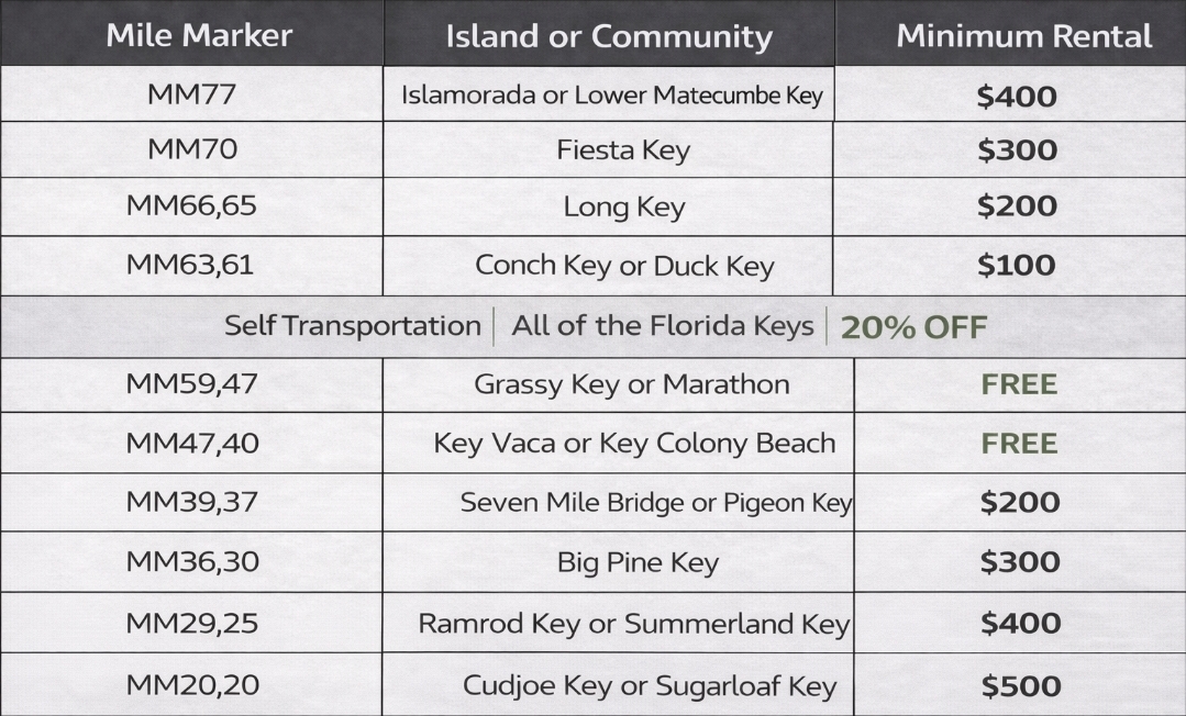 We also deliver anywhere between Mile Marker 20 and Mile Marker 77 still with no delivery fees however a minimum rental total is required the farther you are from our base. Deliveries outside the core zone only leave Marathon after 2 PM so same day morning delivery is not available outside MM forty through fifty nine. If you want to start earlier at a location outside this zone we can schedule sunset delivery the evening before as long as your order meets the minimum amount.