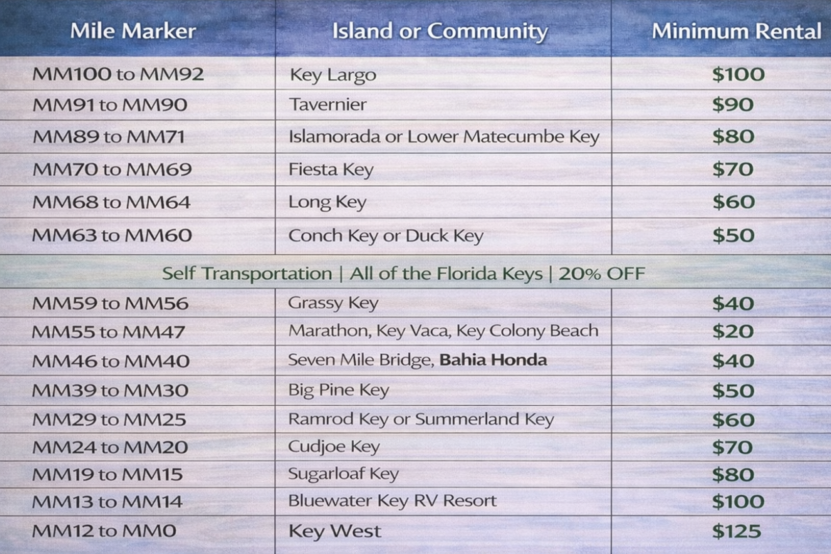 This table below shows the minimum rental or delivery fees by mile marker throughout the Florida Keys.