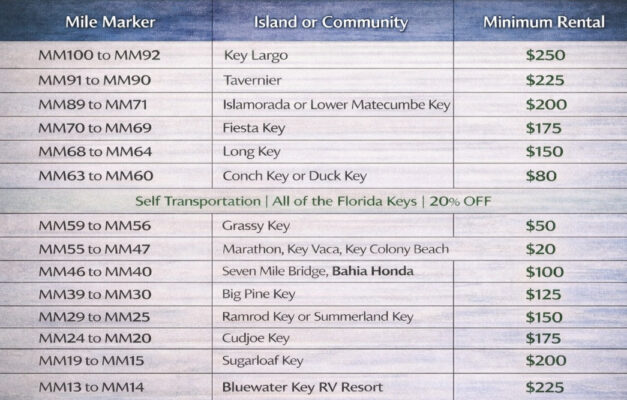 This table below shows the minimum rental or delivery fees by mile marker throughout the Florida Keys.